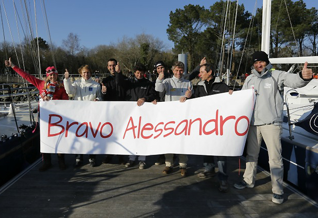 Une dizaine de skippers de la classe IMOCA étaient présents à Port-la-Forêt hier au moment où Alessandro di Benedetto arrivait aux Sables. Ils ont tenu à adresser un mot au dernier concurrent du Vendée Globe. « Tu es certainement celui de nous tous qui a fait le plus rêver durant ce Vendée Globe, avec ta façon très “Dolce vita” de faire partager ta course et ton bonheur d’être en mer. Tu ne t’es jamais démonté même avec une côte cassée ou avec une voile déchirée. Au contraire, tu as vu le Père Noël s’envoler, tu as admiré le paysage du haut du mât de Team Plastique, tu as honoré la gastronomie bretonne avec les crêpes flambées, même le Cap Horn t’a fait un clin d’oeil ensoleillé à ton passage … Pour tout cela, nous t’adressons notre plus grand respect et notre plus grand regret de ne pas être à tes côtés. » Jérémie Beyou, Samantha Davies, Bertrand de Broc, Jean-Pierre Dick, François Gabart, Marc Guillemot, Jean le Cam, Armel le Cléac’h, Vincent Riou, Bernard Stamm.