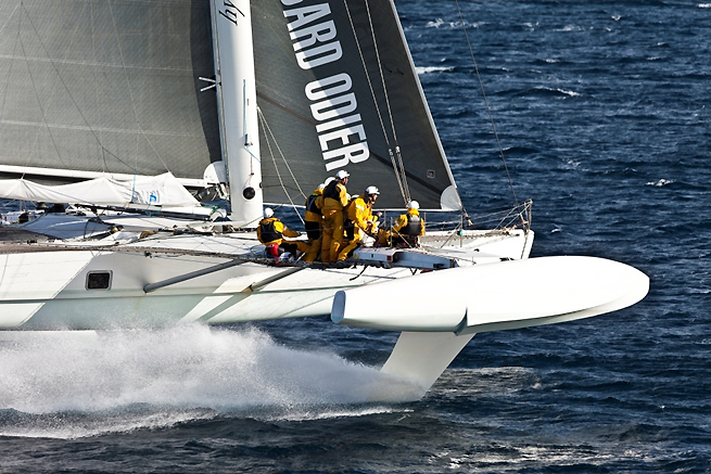 Parmi les candidats qui vont sans doute viser les grands records dans l’avenir figure l’équipe de l’Hydroptère, qui tient à féliciter ce samedi les architectes et l’équipage de Banque Populaire V avant d’ajouter « Avec cette même équipe architecturale et les huit “fidèles papés de l’aéronautique,” auteurs de l’Hydroptère, Alain Thébault rêve du Pacifique avec l’Hydroptère puis de l’Atlantique en moins de trois jours. Les études avancent... »