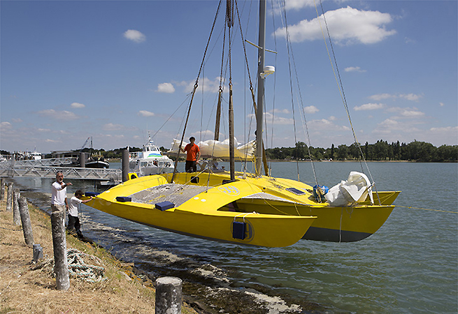 Loïck Peyron au départ en 2018 sur le petit trimaran jaune