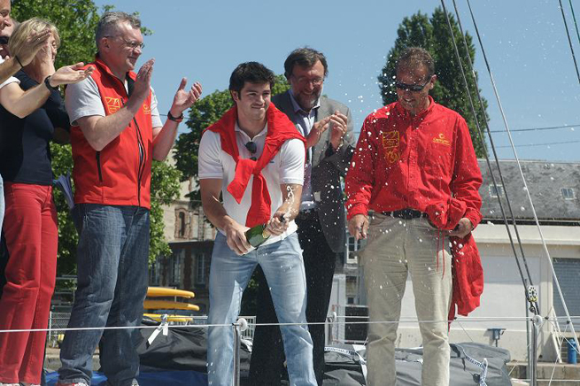 A la veille du départ de la Normandy Channel Race, le Kiwi 40FC Marie Toit-Caen la mer a été baptisé ce samedi midi. Antoine Vigier, hockeyeur des Drakkars de Caen, avait la lourde tâche d’ouvrir la bouteille en la compagnie du skipper Marc Lepesqueux. Marc et Michel Kleinjans, son co-skipper et propriétaire du bateau, doivent encore remplir quelques formulaires, charger la nourriture et l’eau, coller quelques stickers dans les voiles mais aussi se reposer avant de quitter le bassin Saint-Pierre de Caen demain matin.