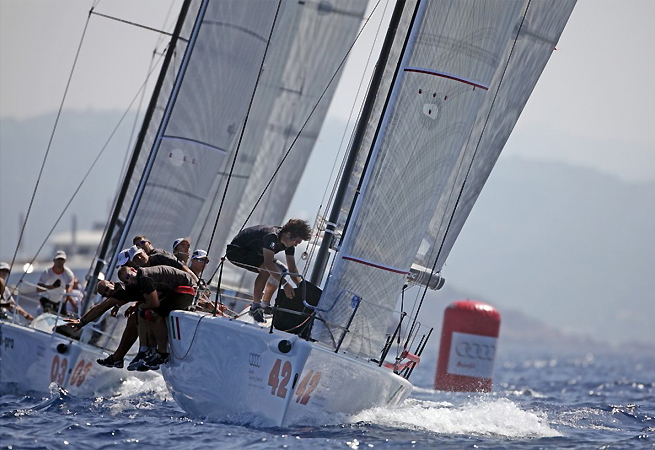 Le vent a fait défaut en Sardaigne hier pour la première journée du Championnat d’Europe de Melges 32. Les équipes ont dû patienter quelques heures, mais trois manches ont néanmoins pu être lancées. Trois bateaux sont à égalité de points au sommet au terme de cette première journée – Flavio Favini sur le bateau italien, Bombarda grâce notamment à sa victoire dans la seconde manche, Jesper Radich sur l’Opus One de l’Allemand Wolfgang Stolz et le Mascalzone Latino de Vincenzo Onorato à bord duquel Nathan Wilmot occupe le poste de tacticien. La première course a été remportée par l’Anglais Joe Woods sur Red, mais ensuite ses résultats ont été plus décevants. Les résultats étaient mitigés aussi pour Mauro Mocchegiani sur Rush Diletta qui a gagné la dernière manche du jour.