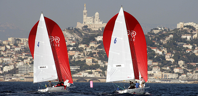 La première journée de compétition s’est déroulée hier jeudi, baignée dans la matinée par un vent très faible. Les premiers duels du groupe A ont débuté vers 11h00 au sud est des îles du Frioul avec des conditions météorologiques idéales. Temps clair et 16 nœuds.