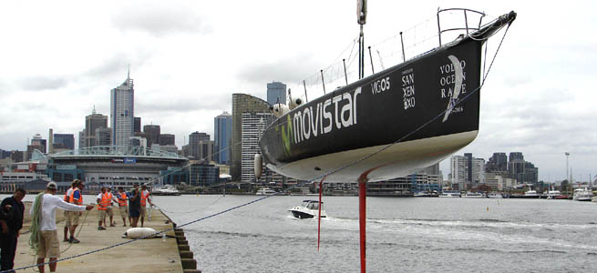 A peine arrivé, déjà en chantier. Le VO70 Movistar a été mis à terre hier, et attend ses nouveaux vérins hydrauliques. Une inspection complète du bateau va être effectuée, et les vérins qui étaient utilisés en entraînement (et notamment lors des convoyages de retour vers l’Europe) retrouveront leur place à bord – aucun souci de fiabilité n’avait été décelé avec ces pièces. Les régates inshore débutent le 4 février, et d’ici là l’équipe espagnole compte bien pouvoir s’entraîner de façon intensive.