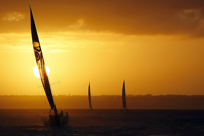 Le départ de la cinquième course du Tour de Bretagne était prévu ce matin à 8h. Mais pour le départ de cette étape de 81 milles entre Douarnenez et Lorient, le vent est extrêmement faible. La flotte avançait donc au moteur vers le raz de Sein. Avec un léger vent de secteur sud qui soufflait à 5 noeuds, le comité de course a donné le départ en début d’après-midi au large du bourg de Plogoff.