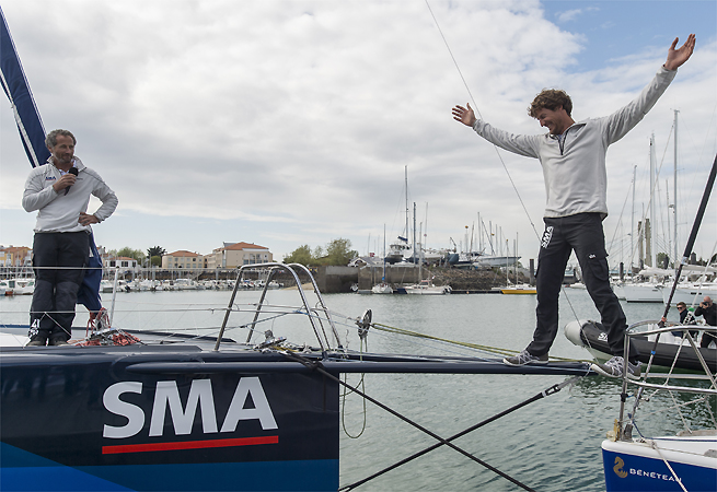 Grand moment de convivialité, hier sur les pontons de Port Olona. En présence de SMA et des équipes Mer Agitée, Michel Desjoyeaux a convié Paul Meilhat à passer du pont de son monotype au pont du monocoque de 60 pieds, convoyé tout spécialement sur les lieux du départ du Vendée Globe 2016. Après cinq saisons pleines sur le circuit Figaro, le skipper SMA va désormais se consacrer entièrement à l’IMOCA.