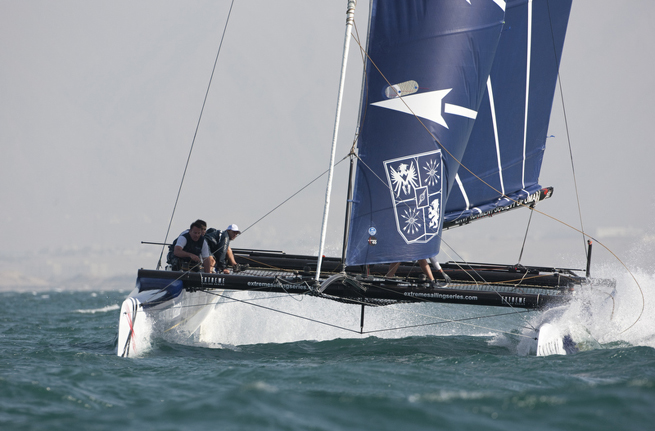 L’équipage français de Pierre Pennec était en pleine forme ce lundi lors de la seconde journée de l’Extreme Sailing Series. Groupe Edmond de Rothschild a en effet remporté trois des cinq courses courues à Mascate. En signant une victoire et en se plaçant bien dans les autres régates de la journée, Alinghi mené par Tanguy Cariou avec Yann Guichard à la barre prend la seconde place dans le classement provisoire. Jouant “à domicile” The Wave, Muscat avait mal débuté l’épreuve, mais a retrouvé la forme pour grimper jusqu’à la troisième place avec une avance de neuf points sur Red Bull.