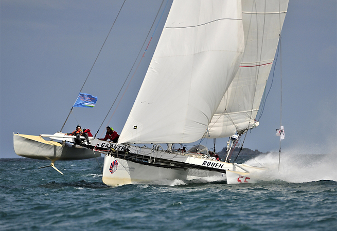 PiR2, pourtant classé Bateau d’Intérêt Patrimonial n’a rien à voir avec un vieux gréement. Construit en 1983, sur plans de Sylvestre Langevin, PiR2 et son unique sister ship Ker Cadelac, naissent en Charentes-Maritime avec l’aluminium utilisé dans la construction de France III, le Défi français du baron Bich dans la Coupe de l’America. PiR2 enchaine les transats, une bonne dizaine : trois Rhum, deux Ostar, des Québec Saint-Malo , et autres Lorient Les Bermudes. Avec Denis Glicksmann il fut Lessive Saint-Marc ; avec Anne Caseneuve, il prit le nom d’Armor Lux. Depuis 2004, redevenu PiR2, c’est Etienne Hochédé qui le bichonne et s’apprête à prendre le départ de sa première Route du Rhum à bord du Multi 50. Etienne Hochédé : « Je suis en fin de carrière. Je commence à me libérer un peu du garage, dans 18 mois j’aurai fini. Il faut que je profite de la vie ! Je pense que le Rhum est une belle course ».