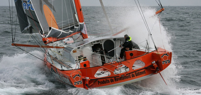 Après 5 heures de course, le monocoque de Vincent Riou tient la tête devant le Foncia de Michel Desjoyeaux. Malgré un départ couvert, le vainqueur du Vendée Globe est parvenu à prendre l’avantage sur ses concurrents dès les premières minutes de course. Vincent Riou et ses quatre hommes d’équipage progressent au près à proximité de la presqu’île de Quiberon à près de 10 nœuds. Ils viennent de virer et font route au sud ouest.