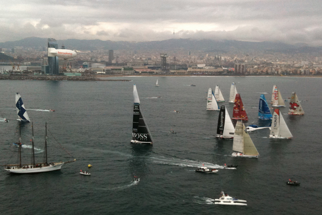 Ordre de passage de la flotte de la Barcelona World Race à la bouée Nord, située à 3 milles de la ligne de départ. Les 14 monocoques y sont parvenus sur un seul bord (bâbord), dans un vent de nord-est faible, de l’ordre de 5 à 6 nœuds.