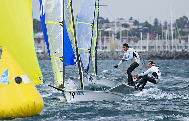 Les Danois Jonas Warrer et Soeren Hansen et les Néo-Zélandais Peter Burling et Blair Tuke terminent la première journée du Championnat du Monde de 49er en tête du classement. Warrer et Hansen ont remporté une nette victoire lors de la première course du jour à Perth arrivant 85 secondes avant leurs compatriotes, Andersen et Thorsell. Les autres manches de la flotte Jaune ont été remportées par les Britanniques John Pink et Rick Peacock et les Allemands, Tobias Schadewaldt et Hannes Baumann. Lors de la troisième course, après leur victoire, Pink et Peacock ont chaviré et ont dû se contenter de la 16ème place.