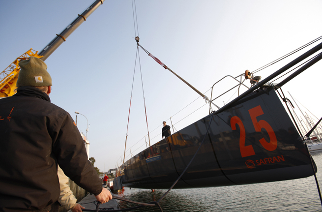 Après deux mois et demi de chantier hivernal, Safran a retrouvé vendredi 16 avril son élément liquide, dans le port de la Trinité-sur-Mer. Six à huit personnes ont œuvré pour que le monocoque à la robe grise et orange améliore encore son potentiel. « Le chantier s’est déroulé en deux temps », explique Thierry Brault, le Team manager. « Après une révision complète de la coque, de sa structure, de la quille, du mât et les réparations nécessaires, nous avons entrepris d’alléger encore Safran. Pour cela, nous avons pu bénéficier une fois de plus de l’expertise des ingénieurs du groupe Safran. Nous avons donc gagné encore en légèreté en changeant par exemple le roof, mais sans rien concéder à la solidité ».