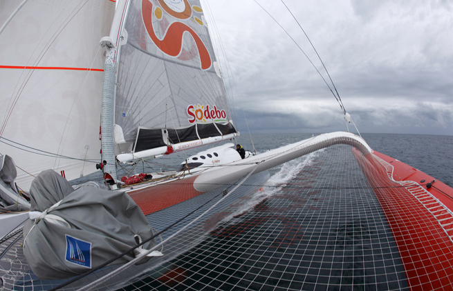 Ce matin, sous les remparts de la cité corsaire, c’était l’heure de pointe. Sodebo, Idec, Gitana 11 et Groupama sont tous arrivés à Saint-Malo. Les concurrents doivent tous être au port avant vendredi 22 octobre à midi. Cette semaine, autour de la Bretagne, c’est donc la grande ruée vers Saint-Malo. Pour un grand nombre de participants cela s’effectue avec peu de vent. Certains vont être obligés de recourir au moteur, tandis que d’autres ont décale leur départ afin d’être à l’heure. Thomas Coville sur Sodebo résume l’ambiance aux abords du port ce matin. « Nous avons fait les derniers milles à une longueur d’écart d’Idec avec un lever du jour absolument somptueux. Gitana 11 était rentré une heure plus tôt et Groupama suivait pas loin derrière. Nous avons croisé beaucoup de bateaux cette nuit, des Class 40 notamment. Je me refuse à dormir pour rester bien actif sur le pont. Nous avions tous cette angoisse du dernier convoyage avec le risque de percuter quelque chose, de subir une avarie, la peur de la dernière tuile qui gâche le travail de tous depuis des mois. »