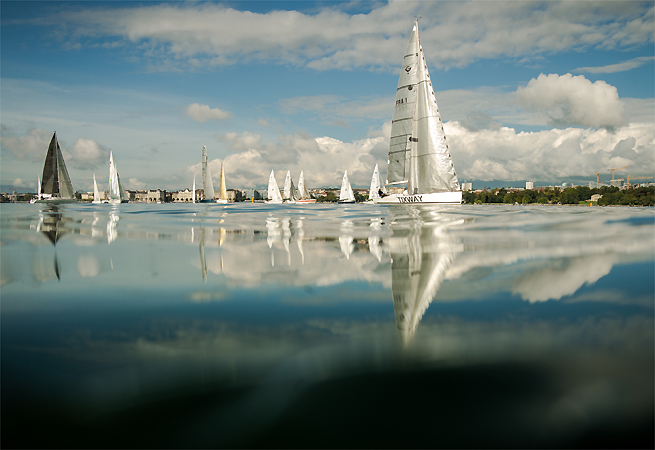 Du côté des monocoques, le courant ouest les dirige entre Hermance et Messery où ils peuvent profiter de la bascule de Rebat qui leur permet de repartir en un bord sur Lutry. Plus frais, les airs montent alors jusqu’à 10 nœuds. Les amis de longue date Alain Gautier et Nicolas Berenger, tous deux à la barre des Psaros 33 Raïjin et Fujin se contrôlent en tête de la flotte. Parti encore plus à droite du plan d’eau, c’est Luc Munier sur le Psaros 33 Banque Paris Bertrand Sturdza qui tire le mieux son épingle du jeu et domine la flotte des monocoques. Revenu par le centre, c’est finalement Jean Psarofaghis, sur son Psaros 40 SYZ & CO, qui parvient à virer la marque de Lutry en 1ère position à 14 heures 41.
