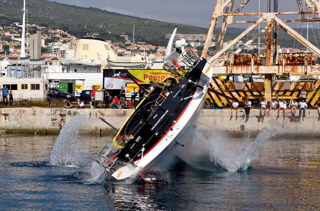 Après sa mise à l’eau hier à La Ciotat, le tout nouveau monocoque de 60 pieds de Bernard Stamm a passé avec succès le test du retournement à 180° avant d’être mâté dans la foulée ce vendredi. Comme l’impose la jauge IMOCA, chaque nouveau bateau doit subir un test de retournement à 180°. Une opération spectaculaire qui consiste à retourner la coque, quille en l’air, à l’aide d’une grue, comme si le bateau était chaviré et démâté avant qu’à l’intérieur, le skipper tente de le redresser, sans aide extérieure, en actionnant la quille pendulaire. Cette épreuve a été passée avec succès ce vendredi matin par Bernard Stamm et Cheminées Poujoulat.