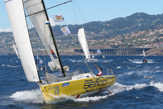 Les neuf Class’40 se sont élancés, qui sous un ris dans la grand voile et foc-solent, qui avec un ris et la trinquette pour aller virer la bouée de dégagement mouillée devant Machico. Il faut dire que les alizés étaient bien au rendez-vous avec vingt nœuds de vent de secteur Nord à Nord-Est, et derrière les reliefs madériens, les rafales faisaient franchement gîter les bateaux. Les plus prompts sur la ligne de départ furent les Sablais Lionel Regnier et Philippe Vallée (Groupe Séfico) suivis par Jean-Pierre Amblard (Azawakh III), Céciel Poujol (Merci les amis !) et Pierre-Yves Chatelin (Destination Calais). Mais sous le vent le vainqueur de la première étape, Yvan Noblet (Appart City) se glissait rapidement en tête et virait le premier la bouée de Machico, à proximité de l’aéroport de Madère.