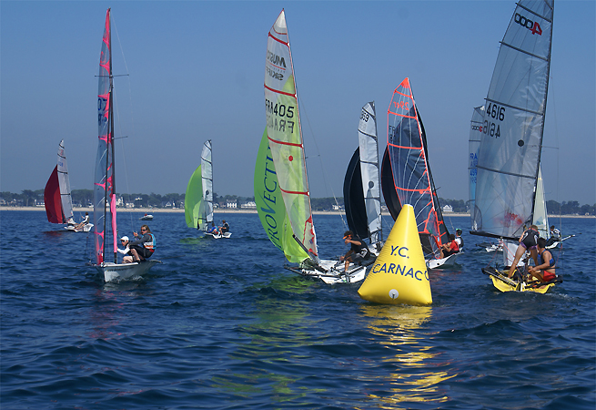 Le Trophée Breizhskiff a rassemblé 43 skiffs à Carnac avec plusieurs séries en lice : les RS 400, 500, 700, 800, les Musto skiff, B 14 et 14’, Iso, 29er, Laser 4000 et les Moth à Foil. Ces derniers n’ont pas eu l’occasion de naviguer faute d’un vent trop léger pour les faire voler. Le vent est resté très faible ce samedi soufflant à seulement 2-3 nœuds. Les compétiteurs ont dû attendre la fin de la journée pour pouvoir régater. Deux courses ont été validées. C’est le RS 400 de Jean-Yves Renon et Ludovic Collin qui a pris la tête du classement général devant Eric Hervé et Clément Benier du CN de Plérin sur RS 500. Hier les prévisions annonçaient 8-10 nœuds le matin, idéales pour une deuxième journée de course. En réalité, c’est une baie de Quiberon aux allures de lac qui attendait les compétiteurs et les membres de l’organisation. Vers 11 h le comité de course a tenté de lancer un premier départ, en vain, retour à terre pour tous. Deuxième tentative du comité vers 13h30, cette fois-ci sera la bonne. Une légère brise de 3-4 nœuds souffle dans les voiles des skiffs et deux courses ont été validées. Jean-Yves Renon et Ludovic Collin remportent l’épreuve. Eric Hervé et Clément Bernier conservent leur seconde position. L’équipage du Yacht Club de Carnac, Nicolas Saillard et Mickael Duflos, monte sur la troisième marche du podium.