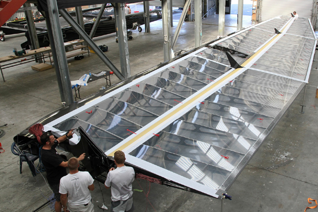 Parmi les équipes à recevoir leur AC45 Artemis Racing. A Silverdale au nord d’Auckland, l’équipe s’apprête à s’occuper des finitions et de l’assemblage des coques, mais d’abord il a fallu décorer les coques dans les couleurs de l’équipe suédoise. Il fallait une trentaine d’heures pour appliquer les sept couleurs et les finitions, car les graphiques sont assez complexes. Pendant ce temps-là, dans le bassin Viaduct à Auckland, d’autres membres de l’équipe technique d’Artemis Racing s’occupaient de l’aile rigide. Les trois hommes ont travaillé pendant trois journées pour déposer des films, qui se rétrécissent à la chaleur formant une peau tendue sur l’ossature carbone. La première sortie de l’AC45 d’Artemis Racing est prévue d’ici la fin du mois. Tout doit être contrôlé et vérifié avant le début des entraînements.