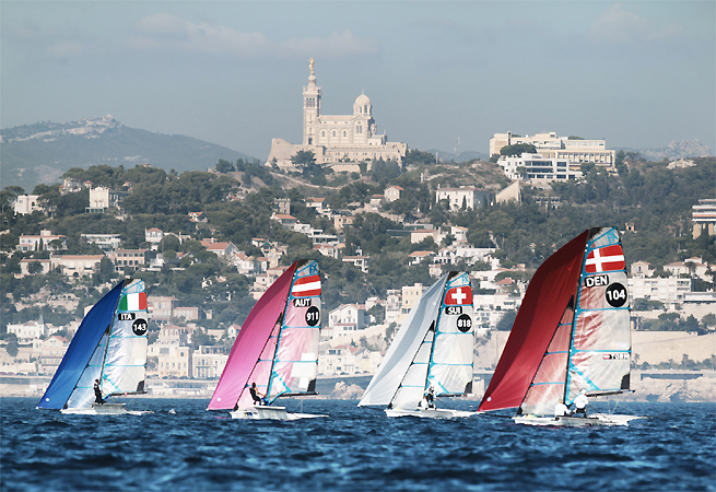 Le vent s’est fait un peu attendre hier pour les participants au Championnat du Monde de 49er et 49er FX à Marseille. Etouffée par la forte chaleur, la petite brise thermique, caractéristique de la rade est timidement rentrée vers 13h00. En début d’après midi, les 150 skiffs ont enfin envahi le bassin du stade nautique du Roucas Blanc pour rejoindre les zones de course. 2 manches ont été lancées chez les 49errépartis sur 3 zones de course en rade sud. Ce sont les Britanniques Dylan Fletcher et Alain Sign, champions d’Europe en titre qui dominaient hier. Toujours premiers sur la ligne de départ, ils avaient toujours quelques bonnes longueurs d’avance sur leurs nombreux adversaires. Ils arborent le maillot jaune attribué au meilleur équipage au classement général.