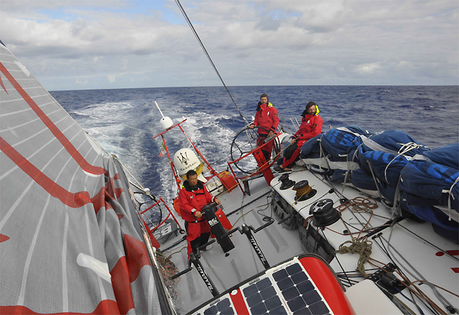 Maserati a pris le départ dans un vent de 15 à 18 noeuds. Depuis, la brise n’est pas aussi forte que voulue et la mer plus agitée après le passage de plusieurs dépressions. L’important pour le skipper italien est d’atteindre un front froid aujourd’hui. Jusqu’ici la grosse déception est cependant l’angle de vent, qui n’est pas comme prévu et qui oblige l’équipage à empanner avec un vent plein arrière. L’ex-ouragan Gonzalo est remonté des Bermudes et perturbe les systèmes météorologiques engendrant moins de vent que prévu dans la zone où navigue Maserati. Cependant, le skipper espère qu’après douze heures frustrantes, ils ont mangé leur pain noir et reste optimiste pour la suite.