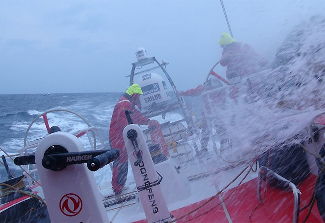 Team Dongfeng poursuit sa transat vers Lorient à 600 milles au sud de la Terre-Neuve. Les conditions n’ont pas été des plus faciles comme l’explique le skipper Charles Caudrelier : “Nous avons eu des moments difficiles avec un vent de 45 noeuds et une mer forte, car le vent souffle dans le sens opposé du courant du Gulf Stream. Nous étions sous J2 et trois ris pendant toute la nuit de dimanche à lundi. Certes ce n’est pas très rapide, mais c’est plus sûr. La fixation de la barre franche tribord s’est détachée. Puis qu’il s’agissait du safran sous le vent, nous sommes partis eu lof…” L’équipage signale aussi un souci au niveau d’une bosse de ris, mais a pu réparer. Depuis, le vent a faibli à une vingtaine de noeuds, mais ce n’était qu’un répit temporaire, car ce matin la brise atteint de nouveau trente noeuds. Caudrelier et ses hommes espèrent profiter de ce vent fort pour remonter vers le nord afin de s’approcher de la route directe vers Lorient.