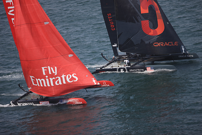 Oracle Coutts prend la tête sur le premier bord de près. Il est suivi à quelques mètres par Spithill avec les Kiwis sur l’autre côté du plan d’eau. A la marque au vent Spithill est et a 20 secondes de retard sur Coutts. Mais sur le bord de portant Spithill prend la droite du plan d’eau et dépasse les 30 nds. Coutts dans un duel avec ETNZ. A la marque sous le vent à la fin du quatrième bord, Coutts revient et n’a plus que 7s de retard sur Spithill, laissant les Kiwis en troisième place. Les autres participants sont très loin derrière.