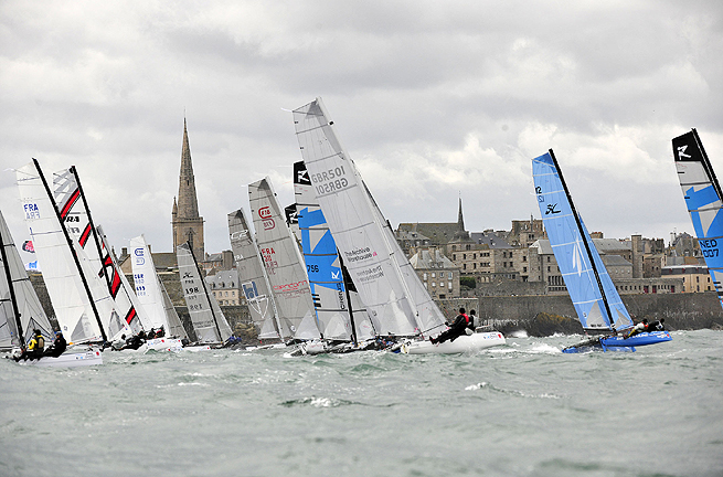 Le soleil est ensuite revenu et c’est par un vent de 15 nœuds que les concurrents débutaient la Route des Forts Hobas qui les emmenait au pied du Fort La Latte. Heemskerk-Tentij en début de course devançait les frères Boulogne et Bontemps-Amiot. Les Australiens Burvill – Duffield tiraient leur épingle du jeu et faisaient connaissance avec les difficultés de la baie de Saint Malo. Le vent a molli et la direction de course a été contrainte de juger la ligne d’arrivée à Saint Lunaire, dans les petits airs. L’équipage hollandais vice champion du monde 2011 accentuait son avance jusqu’à 26 mn sur leurs poursuivants Bontemps-Amiot et remportait au temps cumulé ce 7éme Raid des Corsaires.