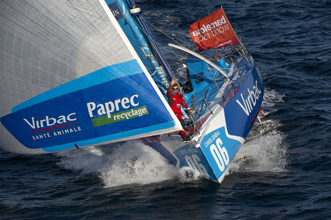 Petit changement en tête de la Barcelona World Race : à l’occasion d’une molle après le front froid qui a permis à Jean-Pierre Dick et Loïck Peyron de battre le record de distance en 24h (plus de 505 milles) samedi matin, Virbac-Paprec 3 a repris les commandes en se glissant subrepticement au Sud de Foncia. Ce petit décalage opéré grâce à un empannage nocturne lui a permis de se placer une quinzaine de milles plus au Sud (sur le 39°50S) que Michel Desjoyeaux et François Gabart afin de conserver un meilleur angle dans cette brise de secteur Sud qui balaye la zone de l’île Gough.