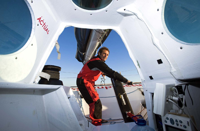 Yves le Blevec à son arrivée aux Sables d’Olonne : « Cette semaine avait pour but de fiabiliser la marche du bateau. Les conditions météorologiques étaient faciles. J’ai pu mettre au point différentes procédures afin d’améliorer la vie à bord. J’ai acquis certains automatismes pour faciliter les manœuvres en solitaire. Au bout du compte, je suis plus ami avec mon bateau après cette semaine. Il n’y a en réalité rien de difficile dans les manœuvres, en tout cas rien d’insurmontable. Le plus délicat est de savoir où mettre le curseur ! En solitaire, le bateau est plus léger et plus volage. Tu es facilement à 20 nœuds voire au dessus. A la barre, tu peux gérer les choses rapidement mais la difficulté s’installe quand tu es à l’intérieur et que tu vas dormir. Les sensations sont différentes. »