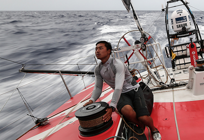 Matt Knighton sur Abu Dhabi Ocean Racing signale également un changement de conditions. “On progresse rapidement et les conditions sont humides. Nous sommes au reaching en bas de l’Inde et progressons à environ 19 noeuds. Cela fait du bien d’avancer de nouveau…”