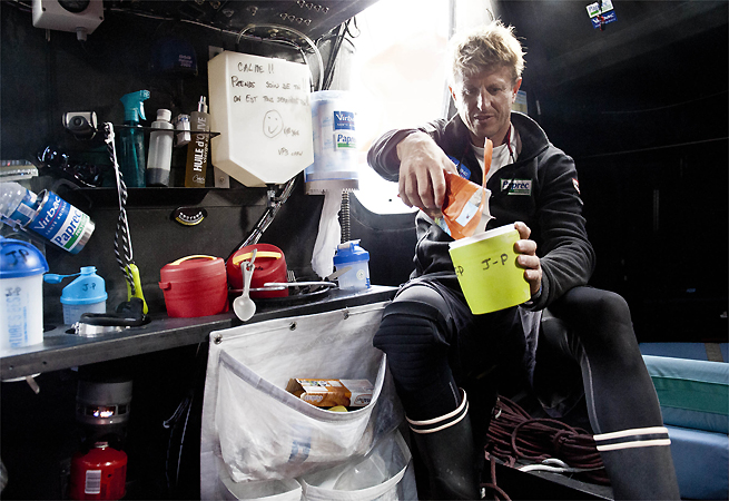 Jean-Pierre Dick : « En mer, tout change. Alors que les besoins nutritifs quotidiens d’un sédentaire sont de 2 200 à 2 700 calories par jour, j’ai besoin de 5 000 calories par jour pour faire face à l’effort et aux conditions de course. Je travaille donc avec une nutritionniste qui élabore des menus correspondant à mes besoins énergétiques, à mes goûts et à la zone géographique dans laquelle je navigue. Par exemple dans le grand Sud, dans un climat froid, on rajoute une collation le matin et le soir composée de fruits secs, oléagineux et de la viande des grisons. Dans le domaine de l’alimentation à bord, la contrainte matérielle est double : gagner le maximum de poids et trouver des solutions pour la conservation optimale des aliments. Je privilégie à 95 % les lyophilisés, principalement pour des problèmes de poids et de facilité d’emploi. C’est très pratique et rapidement préparé ; il suffit de faire chauffer de l’eau dans le jetboil et d’y intégrer les produits lyophilisés. Pour le début de course, je complète le plus possible avec des produits frais, pain, salades préparées, pâtes, lardons, noix, tomates cerises, fromage, saucisson à grignoter, fruits frais. En ce qui concerne la boisson, de l’eau désalinisée, et quelques boissons énergétiques que je consomme en fonction des manœuvres à effectuer. Pas d’alcool à bord, sauf pour célébrer une occasion particulière. Mais il ne faut pas croire que le régime à bord est complètement ascétique. Pour le moral, il est important aussi de se faire plaisir, et je trouve toujours une place à bord pour mes péchés mignons : des biscuits St Michel et Bonne Maman, mais aussi du chocolat et du bon thé. »