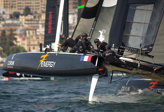 Malgré une pénalité vite effectuée en phase d’avant-départ, Energy Team barré par Yann Guichard joue dès l’entame aux avant-postes. L’AC 45 français parvient à passer la première bouée en troisième position, juste derrière les Italiens de Luna Rossa Swordfish, qui jouent “à domicile”, et Oracle Team USA skippé par le jeune et talentueux Australien Tom Slingsby. La brise de l’ordre d’une dizaine de noeuds est plus stable et les effets de site un peu moins marqués dans cette baie de Naples. En ce début d’après-midi, le vent est encore modéré mais c’est tout de même à des vitesses de l’ordre de 13 noeuds au près et quasiment 20 noeuds au portant que se joue cette troisième course en flotte. Sur le premier bord de près, Energy Team résiste aux attaques de l’autre AC45 italien et à la troisième marque Yann Guichard tient bon ce podium provisoire.