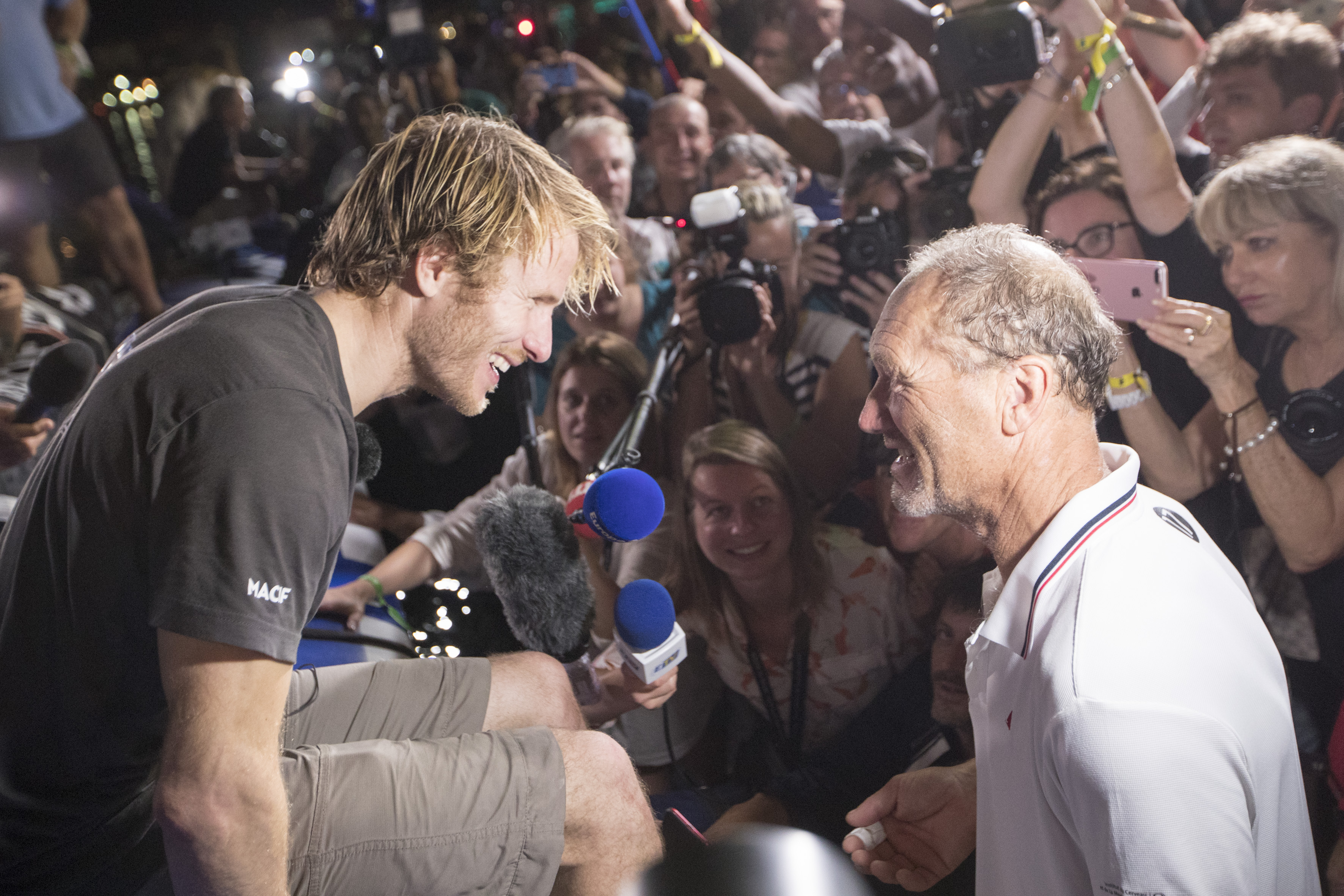 « Je suis content de la course. Cette course aurait pu s’arrêter plus tôt, ça ne se joue pas à grand chose. J’arrive quand même jusqu’ici en Guadeloupe, ravi de m’être tiré la bourre. C’est vrai que je suis deuxième. La victoire, est-ce vraiment ce que je viens chercher systématiquement ? Ces dernières années, j’ai eu la chance de vivre des courses de dingues. Ce que tu retiens à la fin, c’est ça. Ce sont les expériences que tu vis… Je retiendrai que j’ai eu peur, que j’étais tendu quand je voyais Francis revenir, que c’était insupportable. Et ce dernier bord à bord la nuit dans la pétole. Peut-être que demain j’aurais la gueule de bois et que ça fera mal de ne pas avoir gagné, mais je crois surtout que je m’en souviendrai toute ma vie de cette course, parce qu’elle était belle jusqu’au bout. Et j’y ai appris plein de choses”.