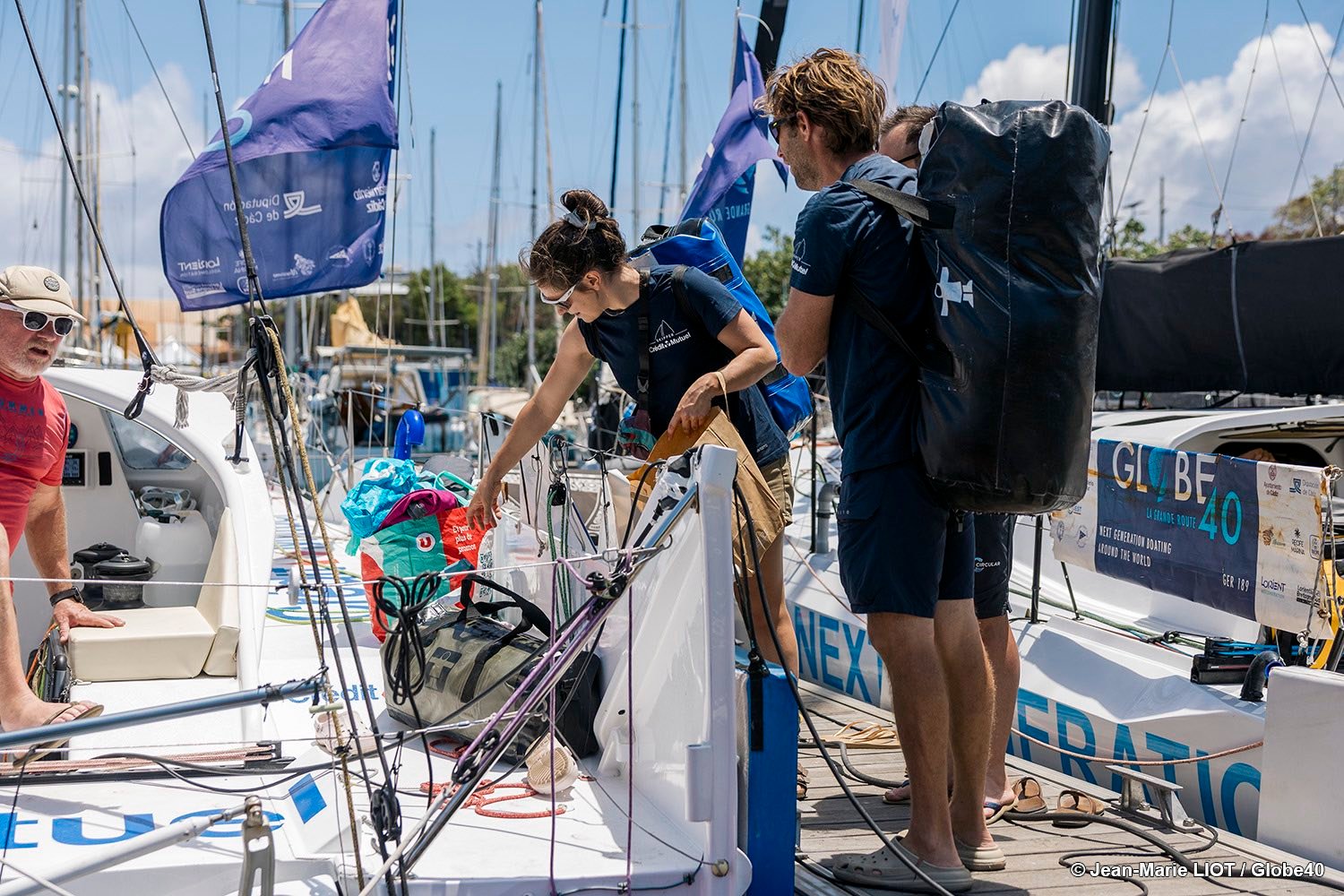 Lors de cette étape, nous avons eu l’occasion de rencontrer l’ensemble des équipages et l’organisation, qui capitalise sur les enseignements de sa première édition réussie. À l’arrivée à La Réunion, les bateaux présentaient peu de problèmes techniques : un filet de pêche avait cisaillé de quelques centimètres le voile d’équipe du bateau belge, une fuite était à colmater sur un ballast, et une perche d’aérien devait être refixée sur le bateau canadien. Le bateau brésilien a eu un léger travail de composite à effectuer sur la coque après un choc sans gravité avec un OFNI. Dans l’ensemble, les bateaux sont beaucoup mieux préparés. Tous disposent désormais de voiles bien plus adaptées, chacune pesant presque le double d’une voile utilisée sur une transat classique, avec davantage de matière. Chaque bateau embarque 12 voiles et dispose de 4 jokers. Il est interdit de changer de grand-voile sans pénalité. À noter que Crédit Mutuel est le seul à disposer d’un mât à ralingue, tandis que les autres scows ont opté pour un chariot de GV. Pour François Angoulvant, mesureur de la Class40 et directeur technique de la course, les bateaux sont clairement mieux préparés.