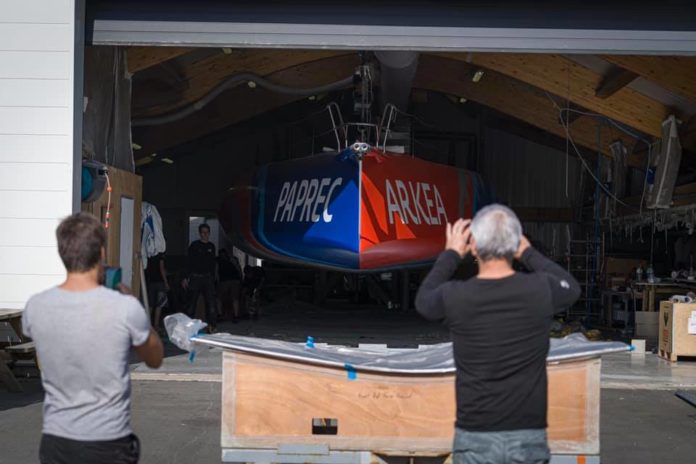 ARKÉA PAPREC a été sorti du hangar en cette fin de journée et installé au-dessus de la fosse permettant la mise en place de sa quille. L’IMOCA de Sébastien Simon sera mis à l’eau demain puis équipé de ses foils la semaine prochaine.