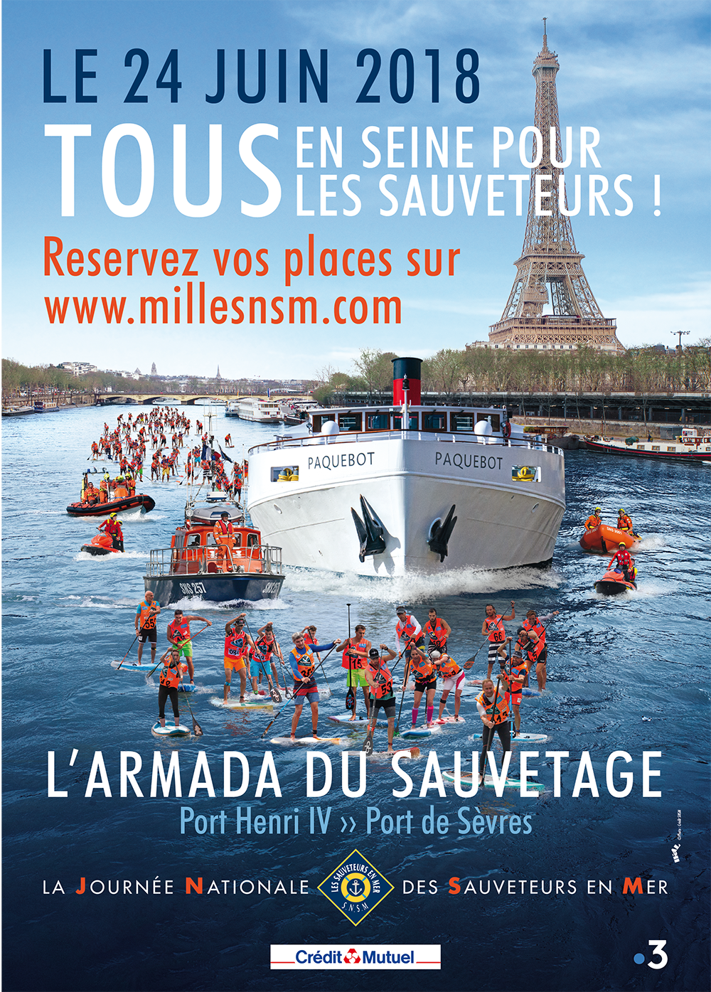 Après avoir déferlé sur les côtes de la Manche, de l’Atlantique et de la Méditerranée, cette vague orange va défiler sur la Seine à Paris. À la mi-journée, du pont Mirabeau au pont de Sèvres, une flotte de jet-skis et semi-rigides de la SNSM escortera une armada de 220 sauveteurs-paddleurs aux couleurs des 219 stations, accompagnés de nombreux représentants de la Marine Nationale et du Cluster Maritime Français, des organismes de secours et des entreprises mécènes. Au coeur de la capitale et aux pieds de la Tour Eiffel, tous pagayeront bord à bord avec des coureurs au large, François Gabart en tête, venus eux également témoigner leur reconnaissance et leur solidarité. Marie Tabarly et Titouan Lamazou donneront le coup d’envoi de ce rallye long de cinq kilomètres.