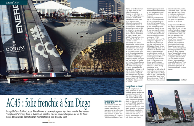 Si Guichard et Pennec avaient voulu donner un coup de projecteur tricolore sur la Coupe de l’America, nos deux boys ne s’y seraient pas pris autrement. Mention spéciale bien sûr à Yann Guichard qui remplaçait à la barre d’Energy Team Loïck Peyron, parti pour une "pige" autour du monde avec le maxi trimaran Banque Populaire V. Mention très spéciale même, car l’équipage d’Energy Team a réussi un double exploit : se hisser en finale du Match Racing contre le Defender Oracle/Spithill, puis terminer 3e de la grande course en flotte finale, derrière ce même Spithill et le TNZ de Dean Barker et juste devant un certain… Aleph. (…)