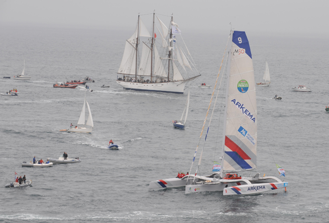 C’est terminé pour La Route des Princes en Multi 50 et cette quatrième étape entre Plymouth et la baie de Morlaix aura ruiné les espoirs d’Yves Le Blévec et son équipage d’Actual… et fait le bonheur inespéré de Lalou Roucayrol qui termine deuxième de l’étape. Son Multi 50 Arkema-Région Aquitaine a franchi la ligne à 14 h 53 mn et 02 s ce dimanche, soit 8 minutes et 38 secondes derrière le vainqueur de cette dernière étape, à savoir le FenêtréA-Cardinal d’Erwan Le Roux et son équipage. Le temps de course d’Arkema-Région Aquitaine entre Plymouth et la baie de Morlaix : 17 h 53 mn et 2 s. Sa vitesse moyenne sur le parcours théorique de 205 milles est de 10,35 nœuds. Mais il a parcouru en réalité 218 milles sur l’eau à la vitesse moyenne de 12,16 nœuds. Venu pour faire une course d’entrainement, Lalou Roucayrol s’offre une victoire quasi inespérée qui le rappelle au bon souvenir de tous. Bravo.