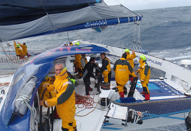 Au quarante-troisième jour de mer depuis leur départ au large du Finistère, et à désormais 1 600 milles du but, l’équipage du Maxi Banque Populaire V sont des marins heureux, qui ont mis le cap vers la maison et un épilogue proche. En attendant, les milles supplémentaires occasionnés par le tour de l’anticyclone ces derniers jours offrent enfin la possibilité d’en tirer d’appréciables dividendes et de dérouler la dernière ligne droite avec une mer très maniable et un vent de Sud qui permet de retrouver les 30 nœuds de vitesse auxquels le Maxi Banque Populaire V avait habitué son monde depuis le coup d’envoi de ce Trophée Jules Verne. Navigant à la limite de la dépression et de l’influence du fameux anticyclone, le trimaran géant devrait rester tribord amures jusqu’à la fin, faisant la transition au fur et à mesure pour passer sur la bordure Nord Ouest de ce même phénomène. Ce régime favorable devrait perdurer jusqu’au franchissement de ligne, avec un léger affaiblissement à prévoir dans la journée de demain avant un retour à 30 nœuds de moyenne.