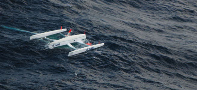 « A priori, l’équipe doit partir demain avec un bateau de pêche pour rejoindre la zone. La balise Sarsat émet toujours, elle a une durée de vie de trois jours. Le mât, bien sûr, a été cassé. Mais quand j’ai quitté le bateau, il était intact au niveau des carénages, au niveau des bras de liaison, de la coque centrale, des flotteurs… »