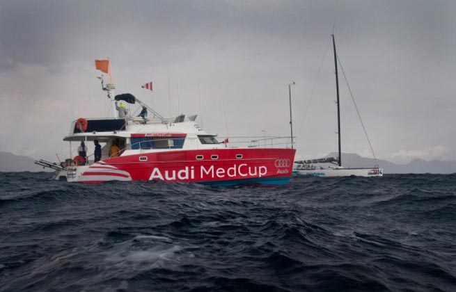 Après avoir quitté le port vers 13h30, les équipages ont attendu sur zone alors que les grains faisaient leur apparition apportant leur lot de pluie et de vents soutenus mais très perturbés. Pendant que les six 60 pieds open de l’Istanbul Europa Race croisaient au large de la baie de Cartagena, Groupe Bel en tête, le Comité de course de l’Audi MedCup tentait en vain de mouiller un parcours, et la seule procédure lancée ce jour a été arrêtée à 30 secondes du départ pour cause de bascule de 15 degrés.