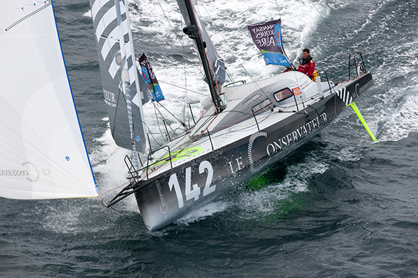 Un sentiment qui n’était pas le même hier pour Pierre Brasseur ne paraissait pas à l’aise : « C’est compliqué, on ne sait pas trop ce qui se passer au niveau du vent ces prochaines heures, alors on met du charbon ! On a eu un vent plus fort que prévu qui devrait mollir mais pour l’instant, c’est difficile de dire si on a une meilleure position que VandB. On est un peu stressé, il revient toujours sur nous, même si on fait le maximum ! On a un ris dans la grand-voile et petit spi. Ça commence à mollir… C’est ciel gris et crachin, c’est ambiance automnale près de chez nous. On est au taquet, il reste 100 milles… On est vigilant. On pense arriver en fin de soirée ce jeudi. »