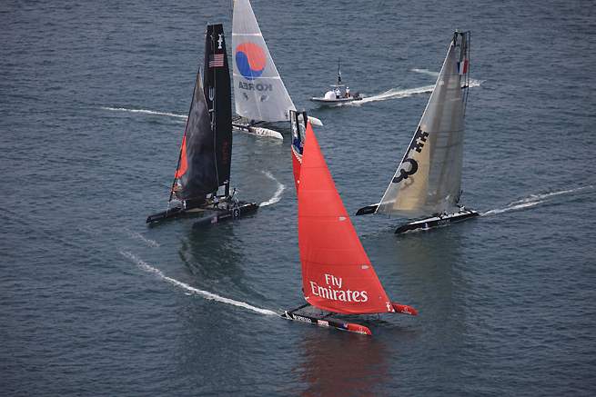 Avec une précision de métronome, James Spithill et ses quatre équipiers ont réalisé un sans faute sur les parcours en flotte, tandis que nous avons peu voir un joli cocotier dans le gennaker kiwi sur la seconde manche. Néanmoins, Dean Barker s’est classé 3,3 et 2 puis a su ensuite contenir la pression de Jimmy sur le duel et emporter la mise. Artemis Racing mené par Terry Hutchinson signe aussi une belle journée avec deux secondes places en flotte mais s’incline dans le match contre Russell Coutts.