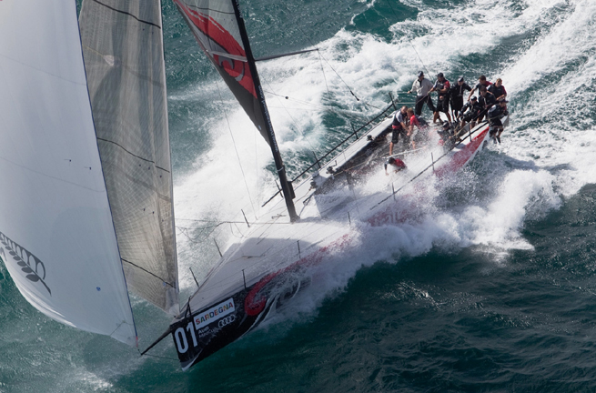 L’Audi MedCup 2010 s’achève sur une des plus belles régates de l’année. Une seule manche a pu être disputée aujourd’hui en baie de Cagliari, mais elle valait le détour. Dans un fort Mistral de 25 nœuds moyens (rafales à 30) et sur une mer presque blanche, grands et petits monocoques ont fait le show. Des surfs à plus de 18 nœuds, des bateaux plongeant sous l’eau jusqu’au pied de mât, barreurs à deux mains sur le stick pour éviter la sortie de route et d’inévitables figures libres.
