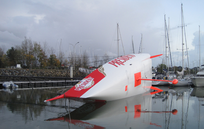 La mise à l’eau d’un bateau est toujours un moment fort pour une équipe de course au large. Celle de Président, le voilier de Jean le Cam et Bruno Garcia pour cette deuxième édition de la Barcelona World Race, ne fait pas exception à la règle. Autour de l’ancien bateau de Mike Golding, loué pour l’occasion, l’équipe technique s’affaire à détecter les éventuels points de faiblesse tout en travaillant à éliminer tout ce qui risque d’être superflu pour un tour du monde. Jean Le Cam constate que lors de la Route du Rhum les bateaux d’ancienne génération tiennent la dragée haute aux prototypes dernier cri.