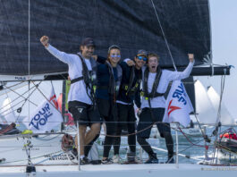 « L’équipage est le même depuis le début du TFV. Mais ce sont des conditions que nous apprécions. Nous avons un barreur expérimenté (Etienne David) qui a déjà fait quelques tours du monde ; les forts coups de vent au portant, il connaît bien ! C’était beaucoup de technique, un beau run de vitesse. C’est vrai que nous passons dans les 15 à la bouée de dégagement, mais ensuite ça n’était qu’un jeu de vitesse. Nous avons traversé la flotte… Ca faisait plaisir ! »