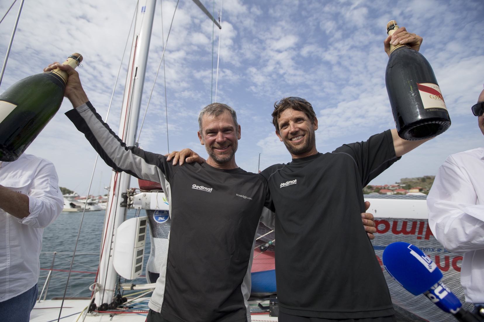 Thierry Chabagny et Erwan Tabarly à bord de Gedimat ont franchi en tête la ligne d’arrivée de la 13e édition de la Transat AG2R LA MONDIALE à 14 h 14 min 53 s (heure française) à Gustavia, Saint-Barthélemy. Leur temps de course est de 22 j 1 h 6 min 53 s. Leur vitesse moyenne sur le parcours théorique de 3 890 milles depuis Concarneau a été de 7,35 nœuds. Ils ont parcouru 4 932 milles sur l’eau à la vitesse moyenne de 9,32 nœuds.