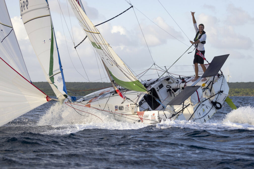Joshua Schopfer, 5e, souvent pointé dans le premier wagon de cette étape entre les Canaries et la Guadeloupe, a su tirer son épingle du jeu dans les rangs compacts de la flotte des bateaux de série. « À l’arrivée, c’était vraiment sympa de revoir le spi bleu d’Antonin (Chapot) de plus en plus proche, mais pas assez proche, malheureusement ! J’ai eu une super belle approche de la Guadeloupe avec les îles… et le ti punch à l’arrivée ! Le bateau va bien, il a quelques petits bobos, mais ce n’est pas trop grave. De cette transat, je retiens beaucoup de mer et de ciel… et beaucoup de poissons volants ! Je ne pensais pas en voir autant. Plus sérieusement, il faudrait un livre pour décrire la Mini Transat. Il y a tellement d’émotions, de vécu, d’expériences magnifiques… Et les copains, la famille qui sont là à l’arrivée, cela fait trop plaisir. Apparemment, il y a un Suisse qui a gagné la Mini Transat… Bravo Mathis ! Deuxième Bourgnon qui gagne, cela montre que la Suisse est bien présente dans la course au large, cela fait bien plaisir. Dans l’immédiat, je ne sais pas trop ce que je souhaite : une bière, les résultats du foot (rires)… »