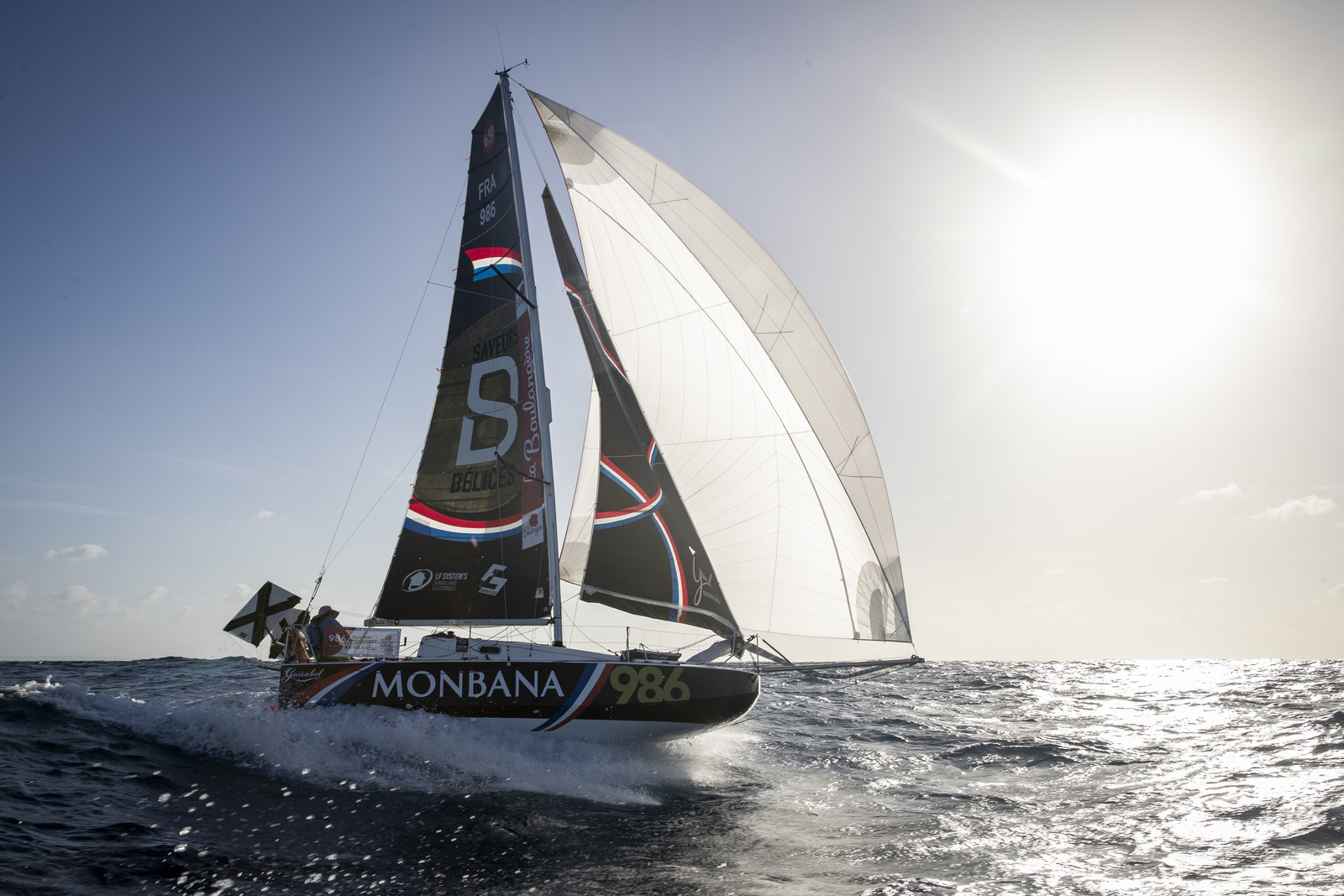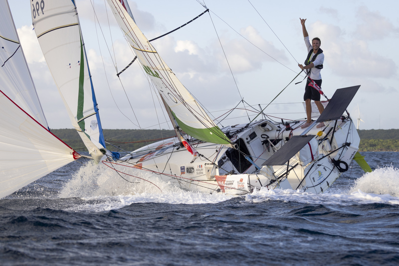 À 26 ans, Quentin Mocudet (986) (Saveurs et Delices ) termine deuxième dans la catégorie série, au terme d’une lutte acharnée avec Amaury Guérin jusqu’aux derniers instants. « Depuis trois jours, nous nous croisons sans cesse, parfois on se perd de vue, puis on se retrouve », raconte Quentin, exténué mais radieux sur le ponton de Saint-François. « Jusqu’à cette nuit, alors que je sortais d’une sieste, j’ai revu mes concurrents à l’AIS et il a fallu continuer à contrôler. Cela ne s’arrêtait jamais. Des grains sont arrivés et tout est devenu incertain : un coup Amaury Guérin reprenait l’avantage, un coup je revenais. Il fallait rester patient et surtout ne pas commettre d’erreur. J’étais soulagé que ça se termine sur une deuxième place plutôt qu’une quatrième. »