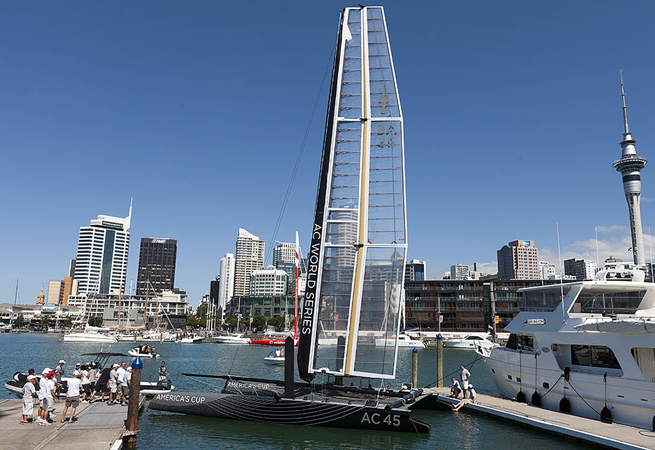 “Aujourd’hui nous avons fait un grand pas en avant,” a déclaré Tim Smyth de Core Builders Composites, constructeur de l’aile rigide. “La sortie et la mise à l’eau du multi avec l’aile rigide en place sont sûrement les étapes les plus difficiles. Nous avons hissé l’aile avec une seule grue pour la première fois (le trimaran USA-17 nécessitait l’intervention de deux grues- ndlr), ce qui valide notre concept. On a encore quelques réglages à effectuer pour être à l’aise avec ce système. On veut surtout faciliter la logistique en vue des World Series.”