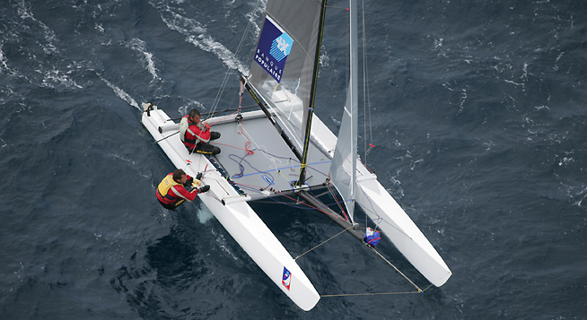 Tout se joue dans un mouchoir de poche au Mondial de Tornado, qui se dispute en ce moment-même en Nouvelle-Zélande. L’équipage composé de Yann Guichard et Alexandre Guyader occupe la troisième place du podium à égalité de points avec l’équipage canadien Johansson/Stittle, actuellement deuxième. Les deux Français, qui occupaient la tête depuis le deuxième jour, ont cédé leur place de leader la nuit dernière, mais les écarts de points sont si faibles qu’ils peuvent encore espérer grimper dans le classement et même atteindre la plus haute marche du podium. Ils ne sont qu’à 5 points des actuels leaders Bundock/Ashby.